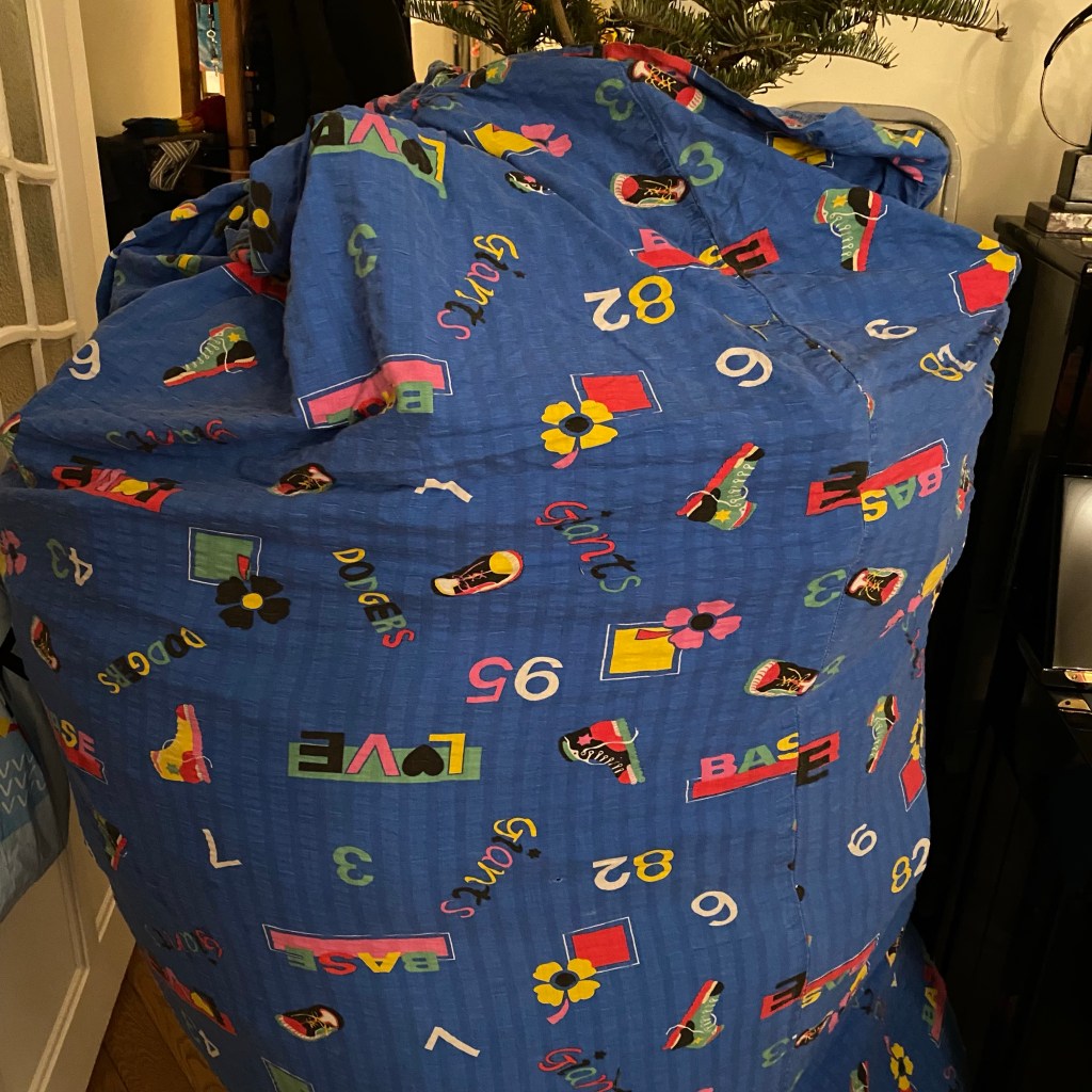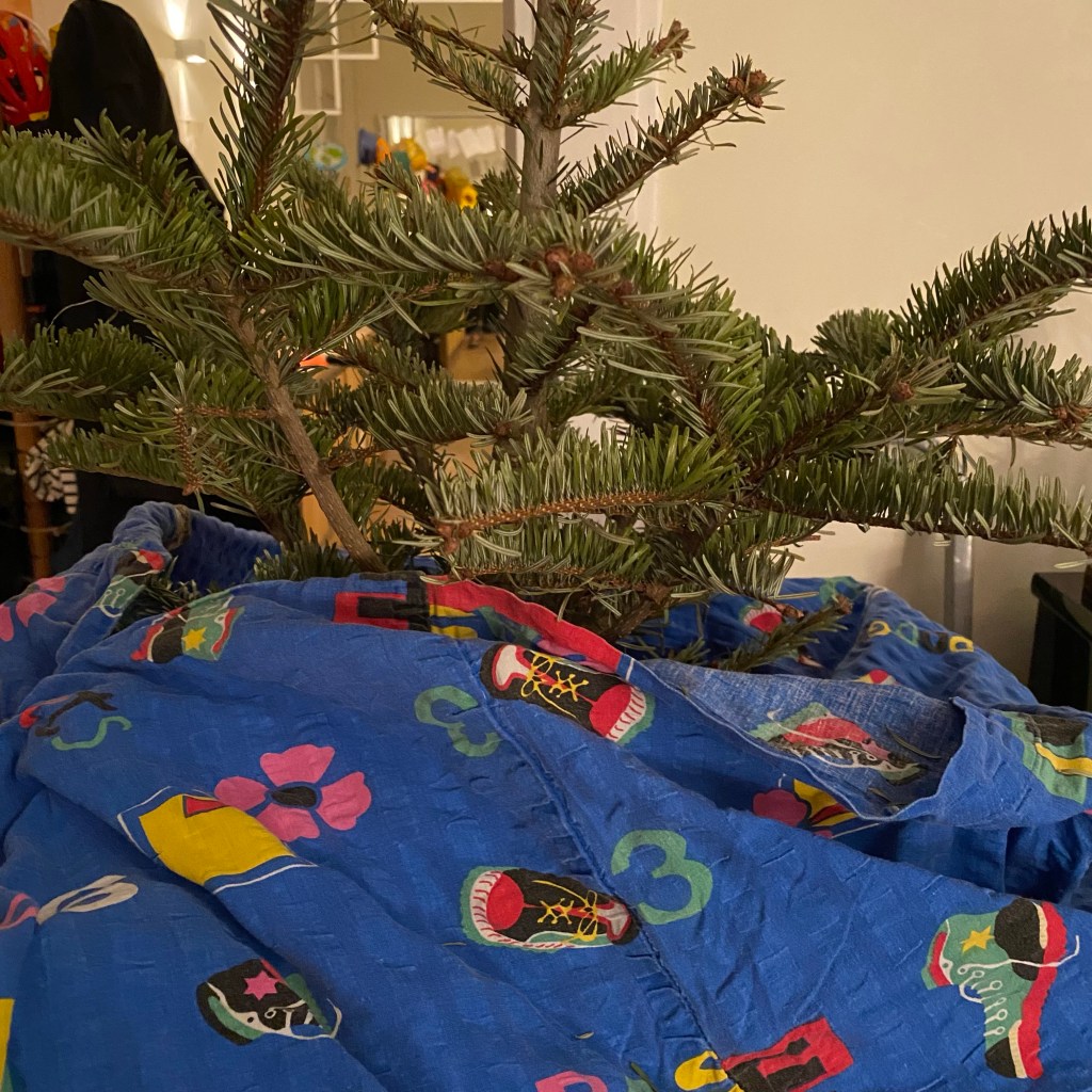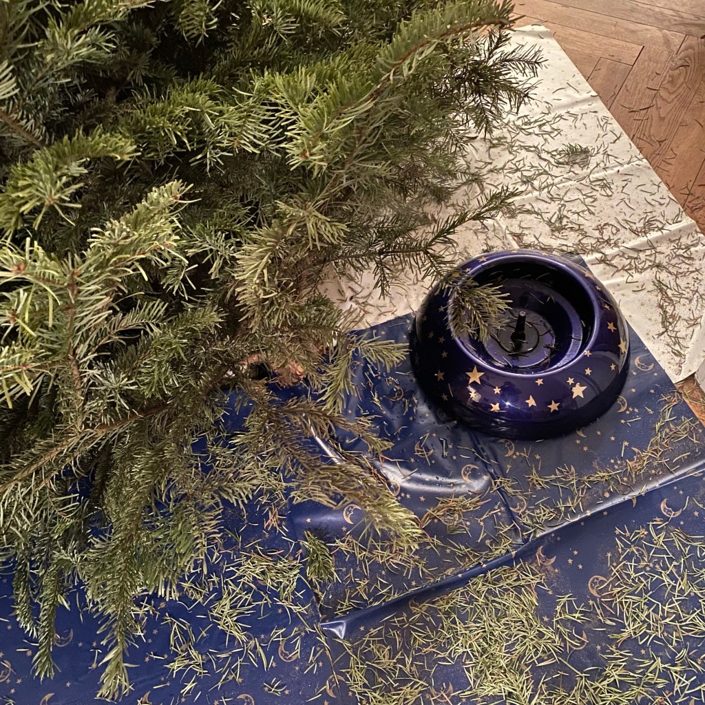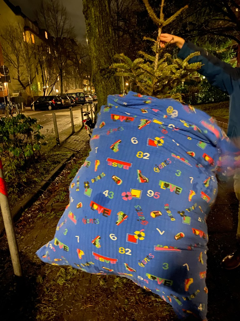 [kneteeis:] „So, der Baum ist schon mal aus dem Ständer. Jetzt probieren wir, ob der Trick mit dem Bettbezug funktioniert, den uns die Nachbarin empfohlen hat!“