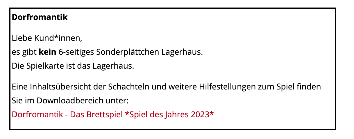 [kneteeis:] „Ich wollte gerade beim Ersatzteilservice bei Pegasus Spiele nach dem Lagerhaus-Plättchen fragen, und da steht, dass es das Plättchen gar nicht gibt! Wir sind also offenbar nicht die ersten, die das vermissen! Die Spielkarte ist einfach das Lagerhaus!“