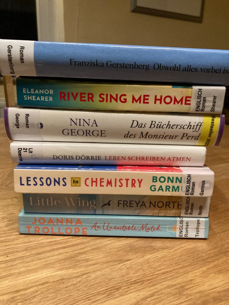 [folienstern:] „Und Galerie von Sonntag – 50 Jahre Playmos! Und Spazieren, und noch mehr Bücher. Das mit dem zweiten Stapel Read-your-height bis zum Todestag meiner Freundin wird aber nichts mehr.“