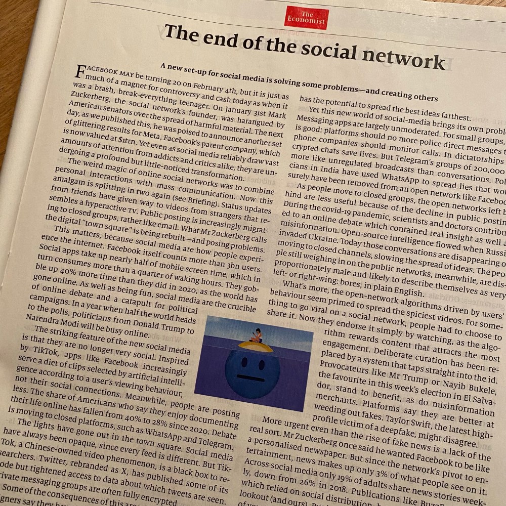 [kneteeis:] „Der Leitartikel im Economist ist richtig spannend diese Woche. Was das wohl für alle Wahlen dieses Jahr bedeutet, wenn social media so viel weniger politischen Content auf den öffentlichen Kanälen haben?“