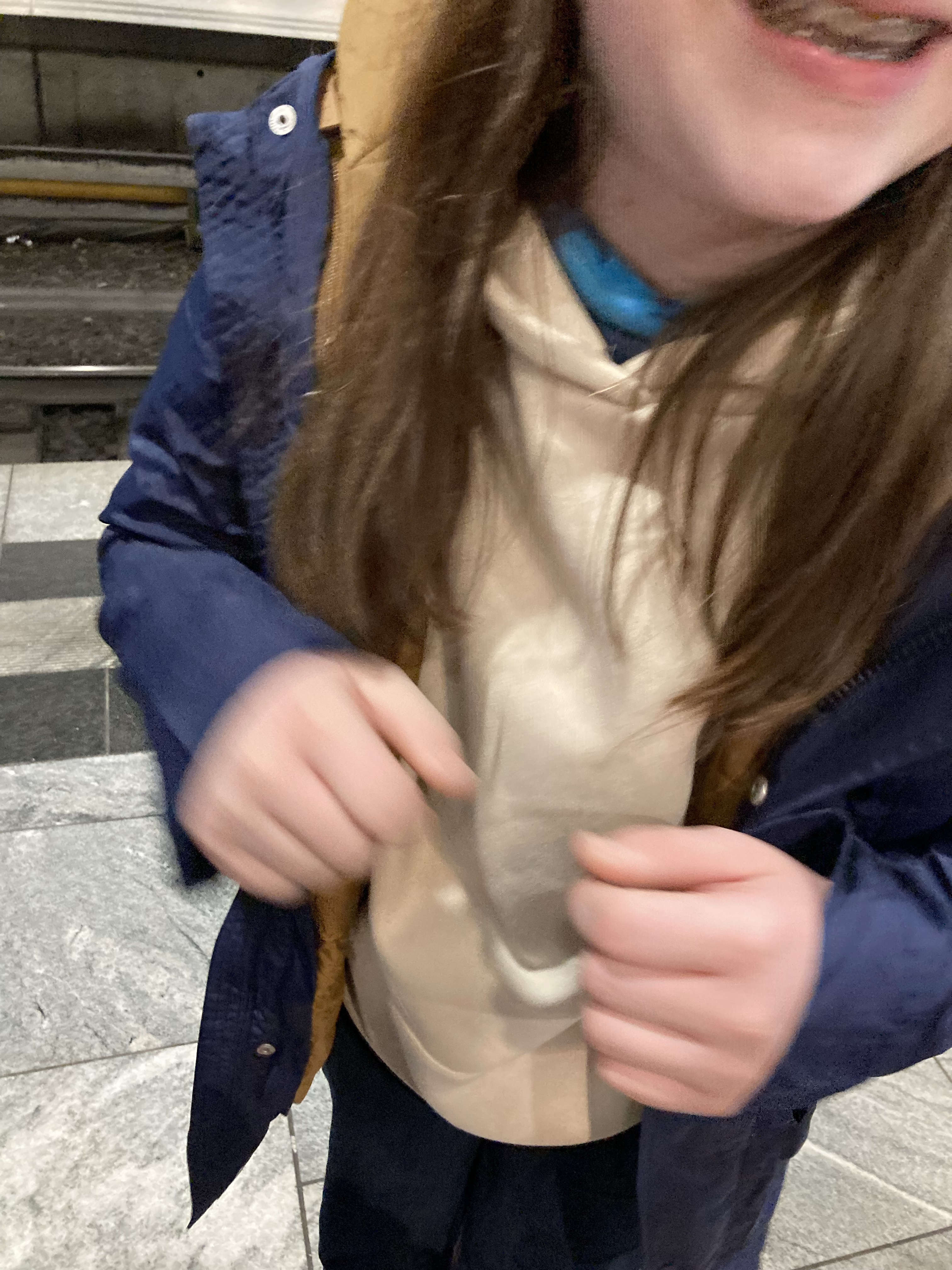 [kneteeis:] „Alles klar. Auf zum Bus – oh, hier liegt ein Schlappen! Eben lag da schon ein Handschuh – da hat jemand nach und nach seine Kleider weggeworfen, scheint mir…“