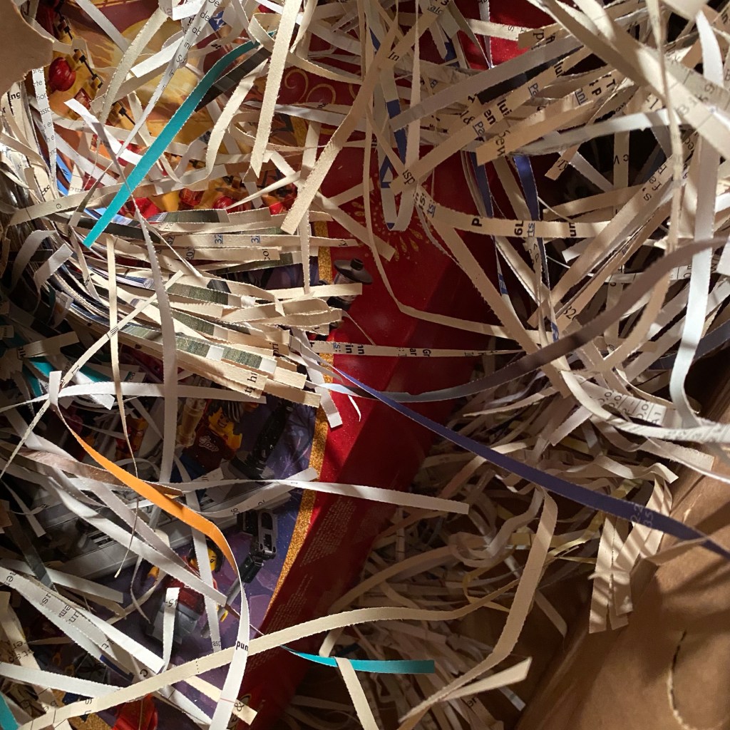 [BB:] „Das ist voll das coole Zeugnis- und Mondneujahrsgeschenk in Eins! Und die Verpackung ist auch lustig mit den ganzen Schnipseln aus dem Aktenvernichter. Wenn wir ganz viel Zeit hätten, könnten wir die wieder zusammenpuzzeln…“