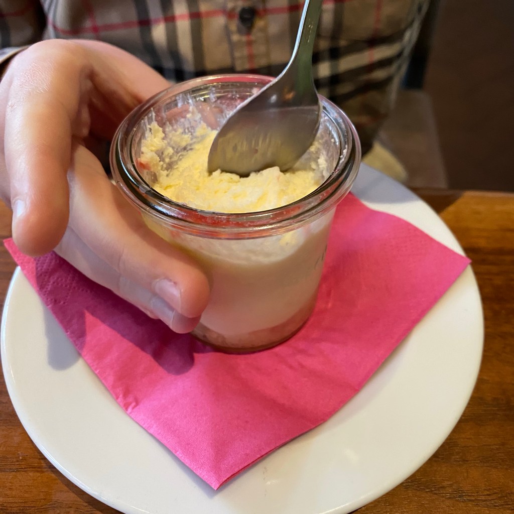 [Kurz darauf. Bedienung:] „Ach ja, wir haben heute keinen Nachtisch, weil wir kein Eis haben. Aber wir haben Cheesecakse. Ich gucke mal, ob ich den freischalten kann!“