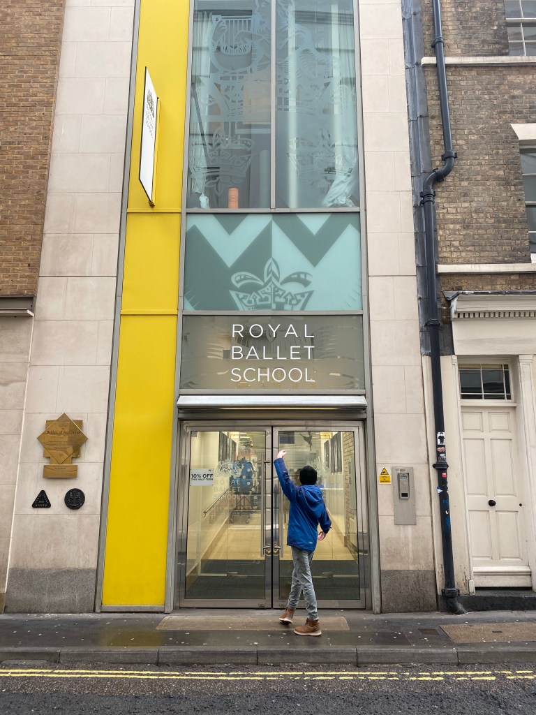 [BB:] „Jetzt können wir ein Bild an der Royal Ballet School machen! Gestern und vorgestern, als da der Intensivkurs war, waren immer so lange Schlangen!“