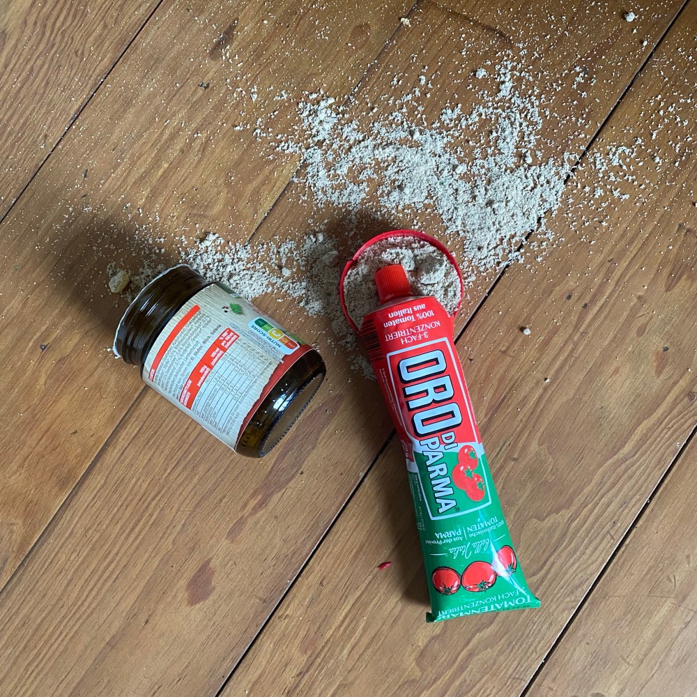 [kneteeis:] „Ja, warte, ich stelle erst das Tomatenmark – oh nein: Jetzt ist das auch noch runtergefallen!“