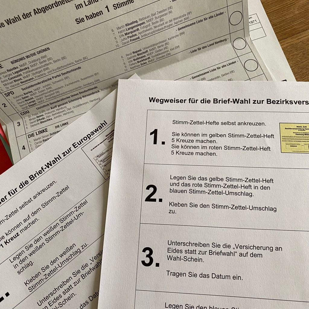 [kneteeis:] „Puh, Demokratie ist manchmal ganz schön mühsam: Erst alle Europa-Wahlprogramme durchlesen für die Europa-Wahl, und dann noch alle Wahlprogramme für die Bezirkswahlen in Hamburg…“