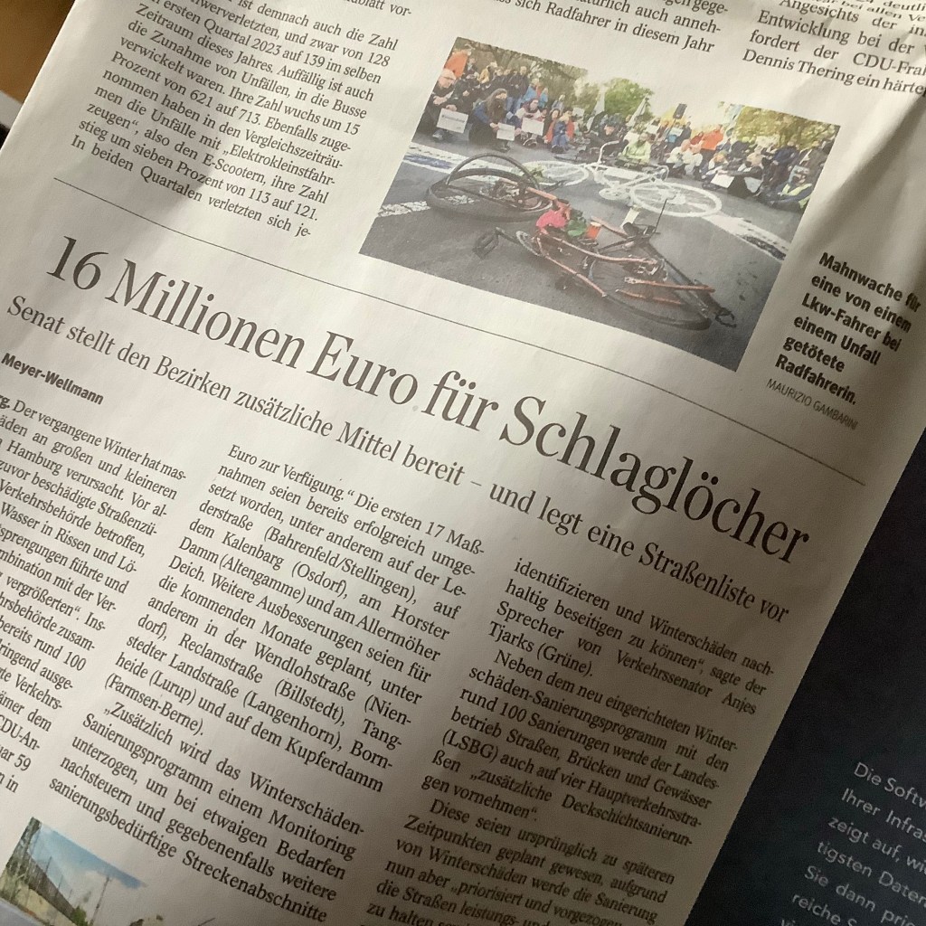 [Kurz darauf. BB:] „In der Zeitung steht, dass die Stadt 16 Millionen für Schlaglöcher ausgeben will. Eigentlich haben wir davon aber doch schon genug, oder?“