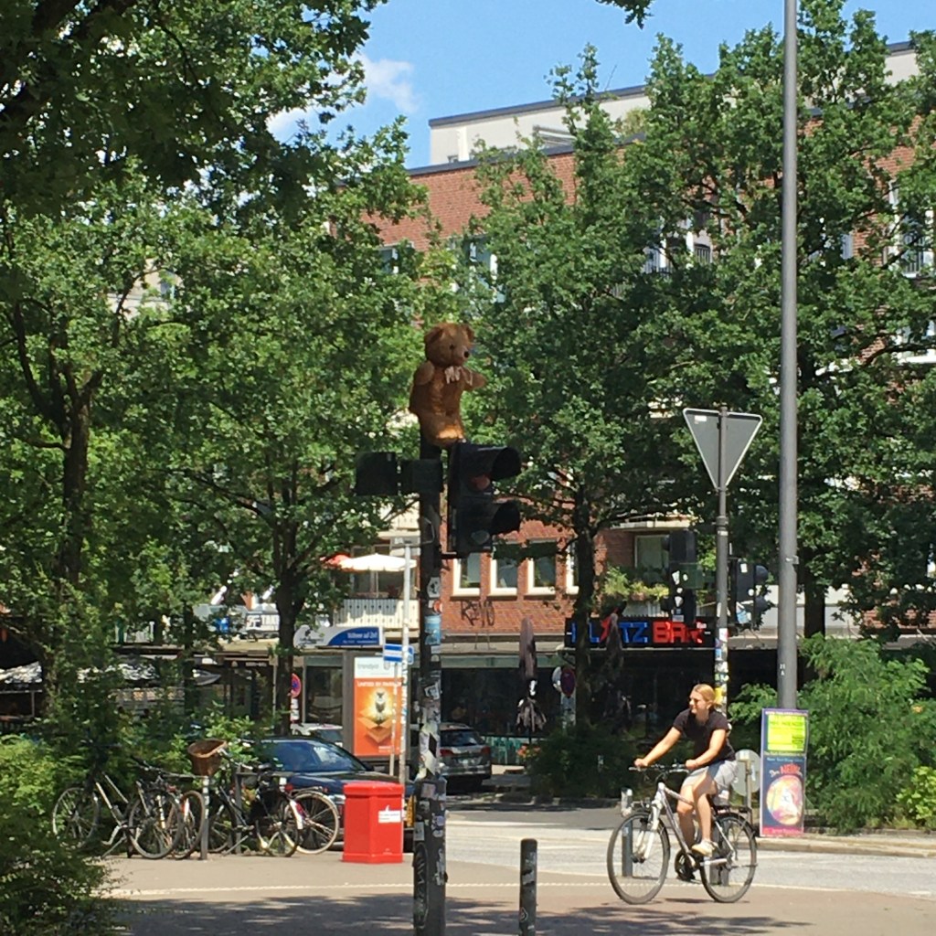 [BB:] „Ich habe übrigens vorhin noch zwei Bilder für den Blog gemacht. Irgendjemand hatte ein Tierfell unter einer Brücke abgelegt, und jemand anders hatte einen Bären auf einer Ampel aufgespießt!“
