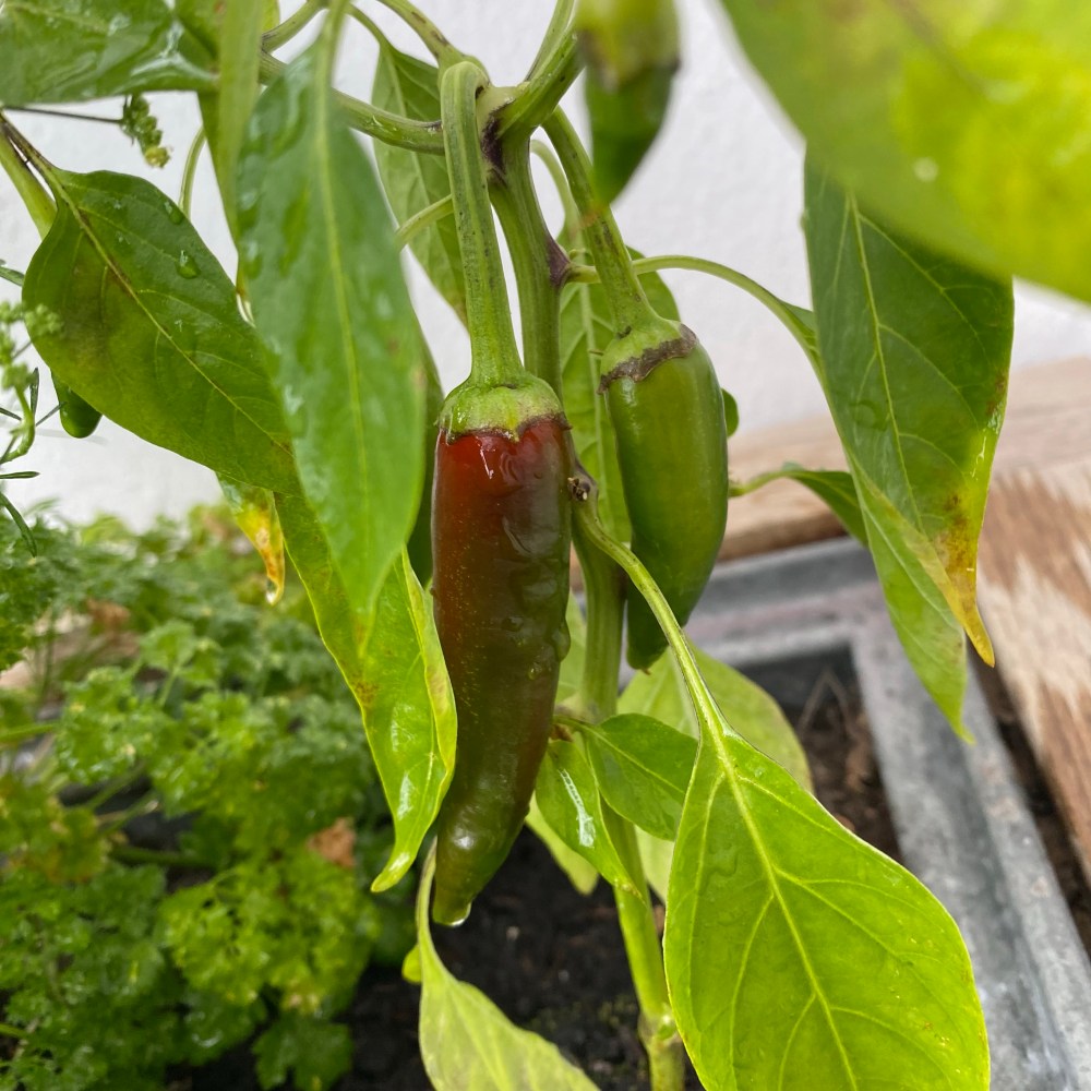 [kneteeis:] „Großer Junge! Unsere grüne Chili wird schon rot! Und aus den kleinen Chiliblüten wachsen schon neue Mini-Chilis!“