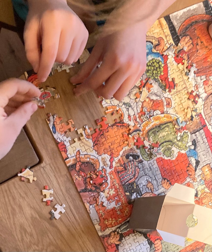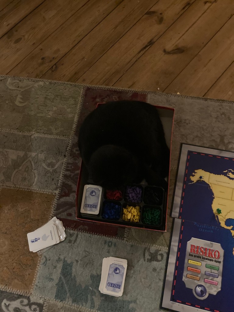 [K2] „Guck mal, der Geldschein steht!“ K3: „Lustig! Machen wir jetzt das Adventspuzzle zu Ende? Und guck mal, die Katze sitzt im Risiko!“