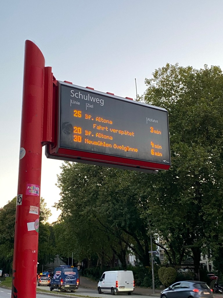 [kneteeis:] „Ach, an der Bushhaltestelle wird ausdrücklich angezeitgt, dass der Bus verspätet ist. Das habe ich ja noch nie gesehen. Ob das mit Absicht ist?“