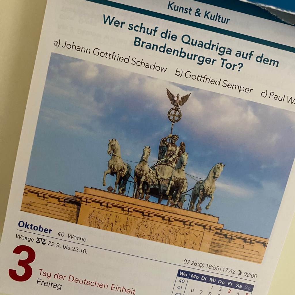 [Ein paar Tage später. kneteeis:] „Wie passend, dass auf dem Kalender für den 3. Oktober die Quadriga vom Brandeburger Tor ist – wo doch der große Junge gerade bei den Berlinern zu Besuch ist!“